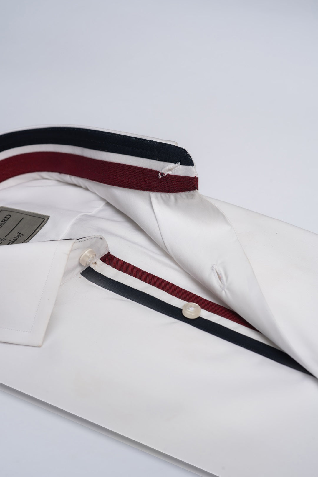 What sets this shirt apart is the striking red, white, and blue tri-band inlay, part of our Sports Collection. Each inlay is handmade using in-house fabrics, individually folded and stitched together with a specially designed technique. This precision finish ensures that the structure of the separate bands is indistinguishable from the rest of the shirt, creating a seamless and eye-catching design.