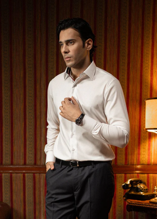 This White Tri-Band Inlay Sports Collection Formal Shirt is a versatile piece that pairs well with any casual or formal garment. Whether you're wearing it with tailored trousers for a formal event or pairing it with jeans for a casual look, this shirt will make a statement. Its bold design ensures it will stand out wherever you wear it.